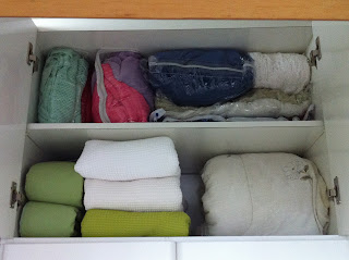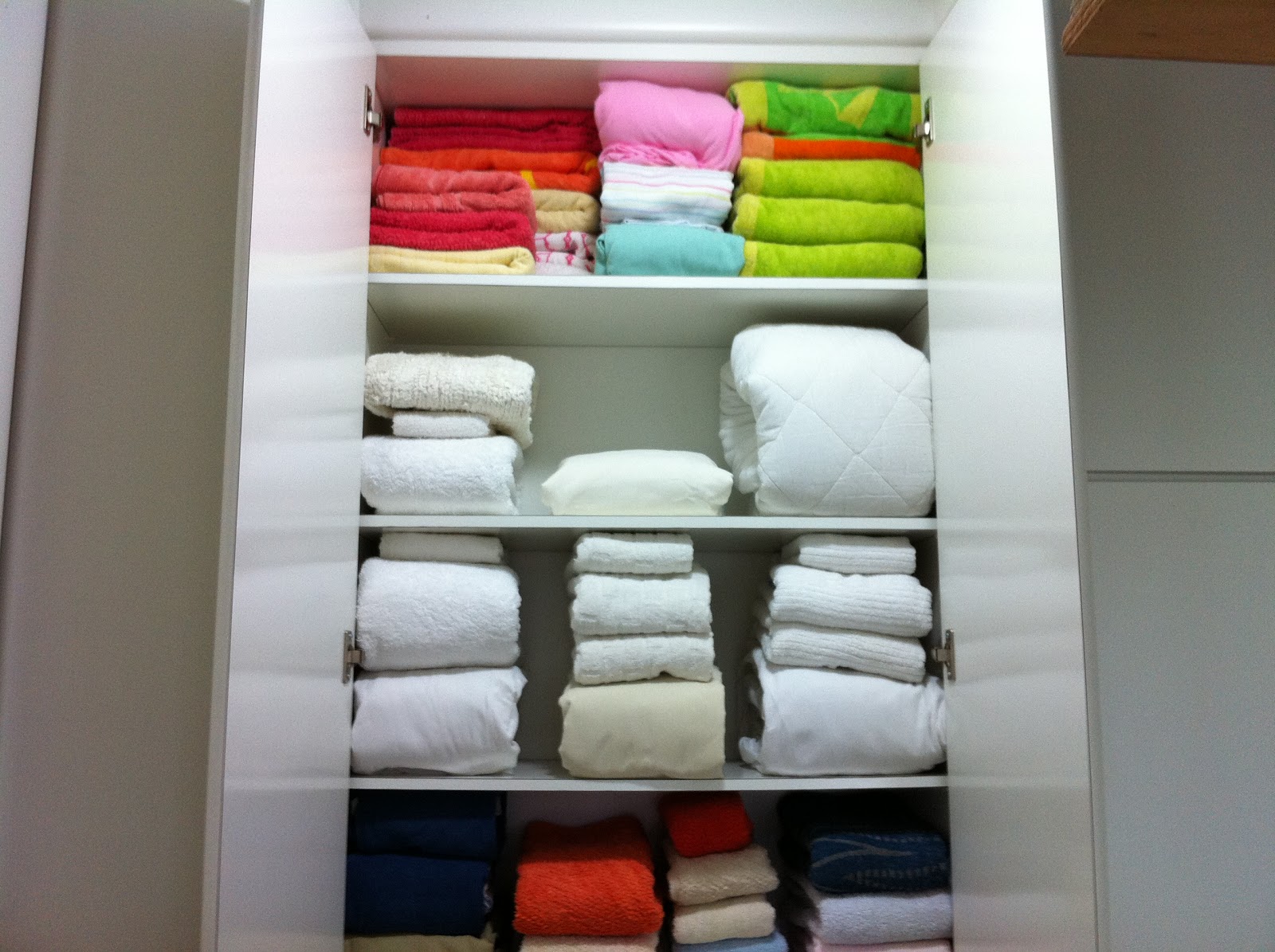 Na prateleira superior foi colocada roupa de cama e banho para visitas e toalhas para clube, peças pouco utilizadas. |