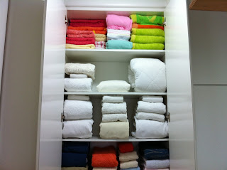 Agora em baixo e com fácil acesso os panos de prato na primeira coluna, na segundo pano para cobrir o fogão, as toalhas de mesa e por trás as toalhinhas de mão. |